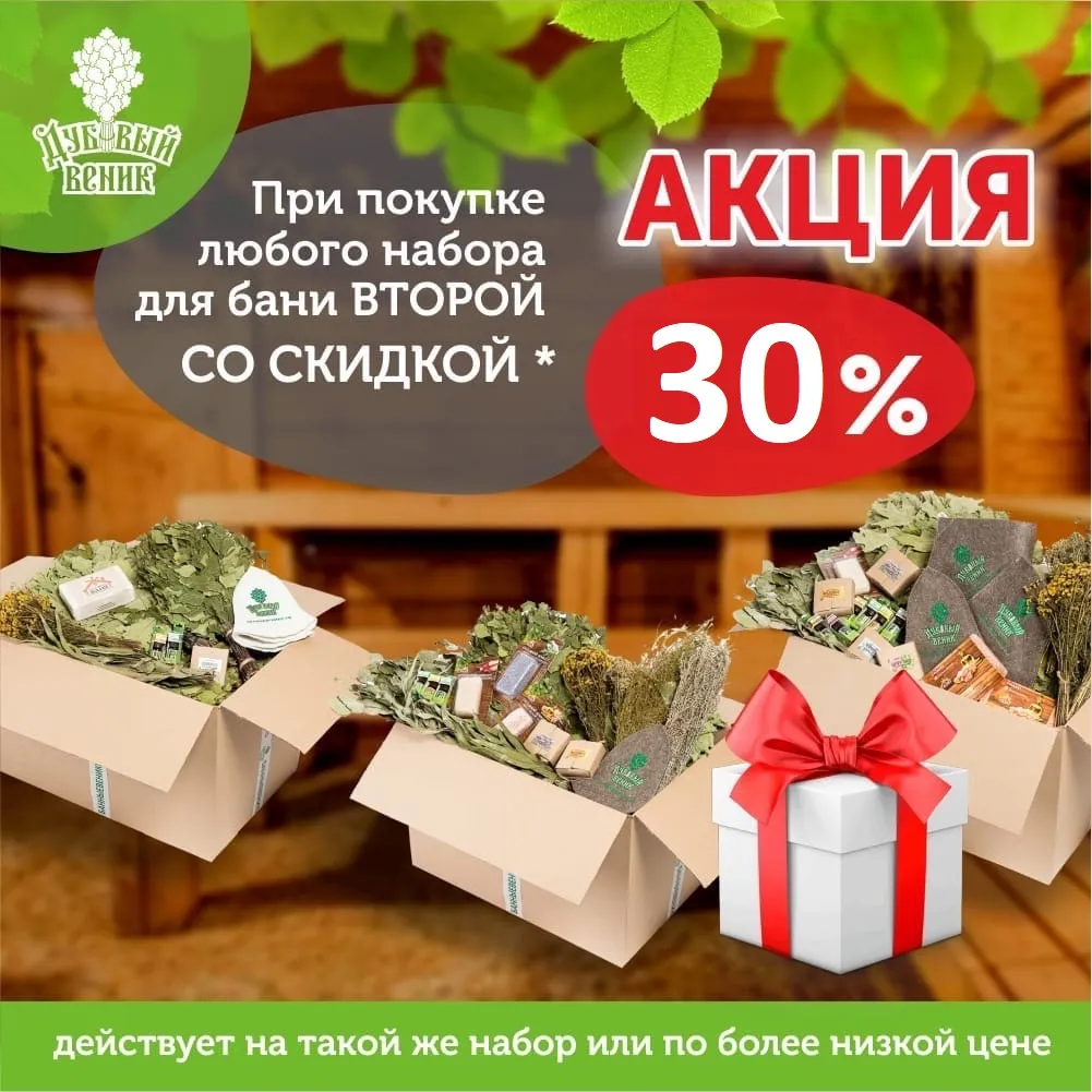при покупке двух или более наборов для бани, на каждый второй набор по такой же или более низкой цене будет сделана скидка в размере 30% от стоимости набора;